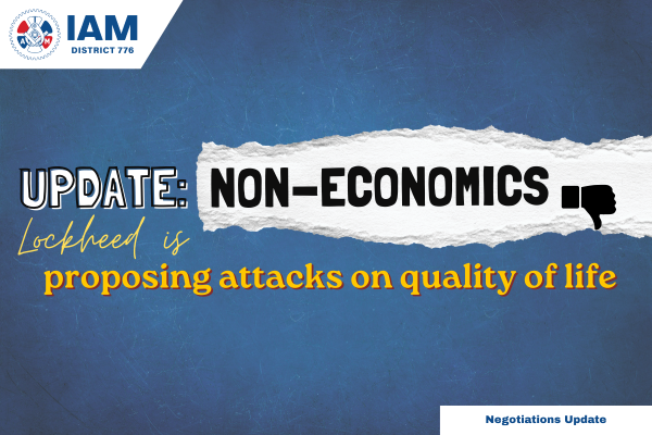 The Union received Lockheed’s non economic proposal waging attacks on the memberships quality of life. Your elected committees staunch advocacy for improved work life balance was profound in counter proposals this morning. Please join your committee in blackout Thursday tomorrow by wearing your strike shirts!